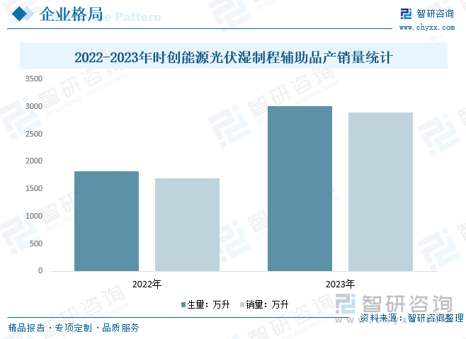 时创能源凭借卓越的科技创新能力,短短几年便跻身于光伏能源行业强者之林。时创能源相继推出了光伏湿制程辅助品、光伏设备及光伏电池三大类主要产品,主要从事相关产品的研发、生产和销售业务。公司的辅助品类产品包括制绒辅助品、抛光辅助品、清洗辅助品等,主要用于光伏电池生产的制绒、刻蚀抛光、清洗等环节。据企业公告数据显示,2023年时创能源光伏湿制程辅助品生产量3011.49万升,同比增长64.45%;销量2896.47万升,同比增长70.69%。