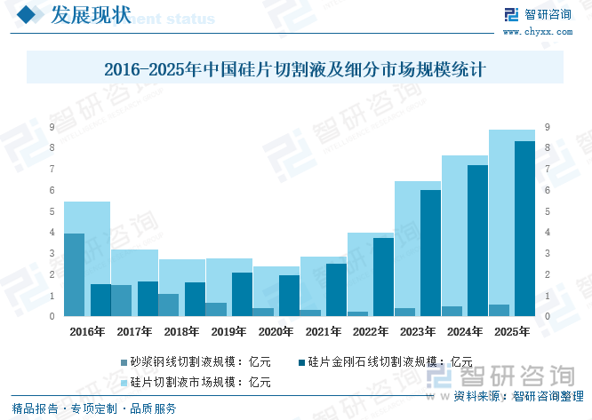 内容概要:硅片切割液是半导体制造过程中的重要辅助材料,用于在切割硅晶圆时起到冷却和润滑的作用,同时帮助去除切割产生的碎屑。硅片切割液行业是半导体和光伏产业的重要支撑。近年来,随着国内科技的不断进步,硅片在电子、光伏等领域的应用日益广泛,直接推动了我国硅片切割液市场的增长。2024年我国硅片切割液市场规模7.67亿元,其中,砂浆钢线切割液规模0.49亿元,硅片金刚石线切割液规模7.18亿元;预计2025年我国硅片切割液市场规模约8.89亿元,其中,砂浆钢线切割液规模约0.57亿元,硅片金刚石线切割液规模约8.32亿元。随着全球对清洁能源需求的不断增加,硅片切割液市场规模将保持增长,硅片切割液行业将迎来更加广阔的发展空间。未来,硅片切割液行业技术将朝着环保化、功能复合化、循环利用方向发展。