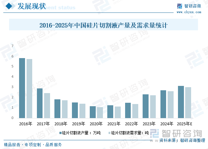 硅片切割液行业是半导体和光伏产业的重要支撑。近年来,随着国内科技的不断进步,硅片在电子、光伏等领域的应用日益广泛,直接推动了我国硅片切割液市场的增长。2024年我国硅片切割液需求量2.61万吨,较2023年增加0.4万吨;预计2025年约为3万吨。硅片切割技术不断升级,要求切割液行业不断推出新产品以满足市场需求。2024年我国硅片切割液产量为约2.72万吨,较2023年增加0.4万吨,预计2025年约为3.12万吨。