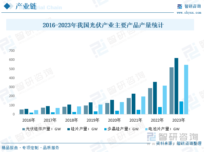 2019年,尽管在政策调整下,我国光伏应用市场有所下滑,但受益于海外市场增长,我国光伏各环节产业规模依旧保持快速增长势头。在产业制造端各环节,截至2023年底,我国多晶硅产量达143GW,较2022年增长60.3GW;硅片产量为622GW,较2022年增长265GW;电池片产量为545GW,较2022年增长227GW;组件产量达到518.1GW,较2022年增长229.4GW。