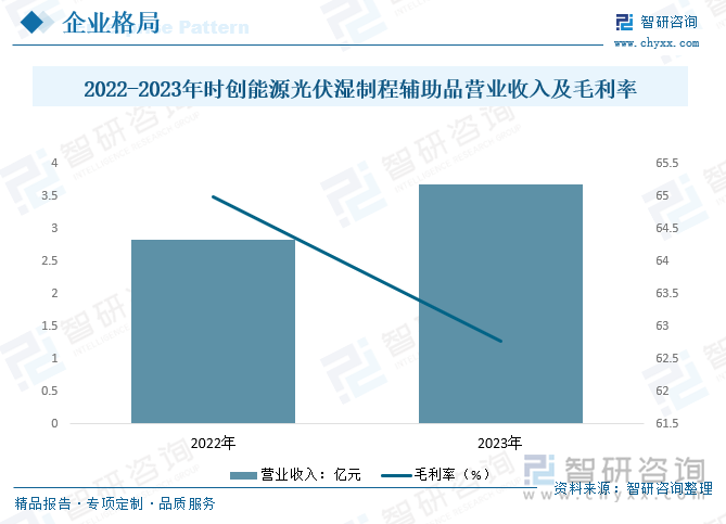 从营业收入方面来看,2023年时创能源光伏湿制程辅助品营业收入3.67亿元,同比增长29.54%;毛利率62.76%,较2022年减少2.22个百分点。