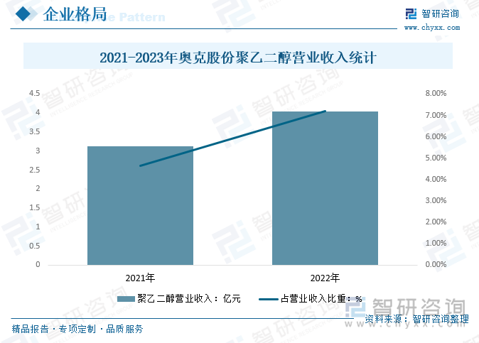 奥克股份是以太阳能多晶硅切割液、高效混凝土减水剂和衍生精细专用化学品为主导产品的精细化工高新技术企业,主导产品太阳能电池用晶硅切割液占据国内市场大部分份额,是全球规模最大的光伏晶硅切割液专业制造商之一。据统计,2023年,奥克股份聚乙二醇营业收入为4亿元,占总营收的10.5%。