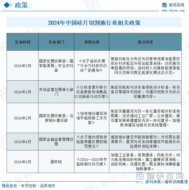 我国政府高度重视新能源、新材料等领域的发展,光伏行业作为国家“双碳”计划的重要战略新兴产业,受到国家政策的大力支持。近年来,我国政府出台了多项政策支持半导体和光伏产业。例如,2024年5月,国务院颁布的《2024—2025年节能降碳行动方案》明确提出加强工业装备、信息通信、风电光伏、动力电池等回收利用,建立重要资源消耗、回收利用、处理处置、再生原料消费等基础数据库,这对硅片切割液行业形成了有利的政策环境。