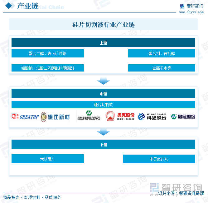 硅片切割液行业产业链上游主要原材料包括聚乙二醇、表面活性剂、螯合剂、有机醇、钼酸钠、油酸二乙醇酰胺硼酸酯和去离子水等;硅片切割液生产位于行业中游;行业下游主要应用于光伏硅片以及半导体硅片的切割环节,是硅片生产过程中的重要耗材。目前硅片切割液大多采用水溶液切割液,是分子量为300~400聚乙二醇和其他物质的复配,产品的性能稳定,透明度好,腐蚀性小,在切割过程中成品率较高,硅片质量较好,且产品易于回收。