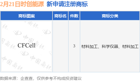 今年以来常州时创能源股份有限公司新申请注册商标8件,截止目前公司共持有注册商标45件,另有24件商标尚在注册申请中。