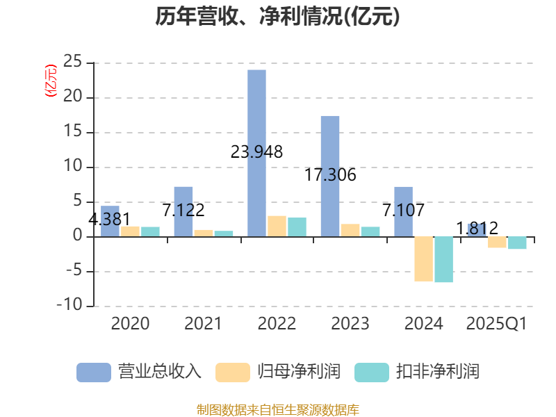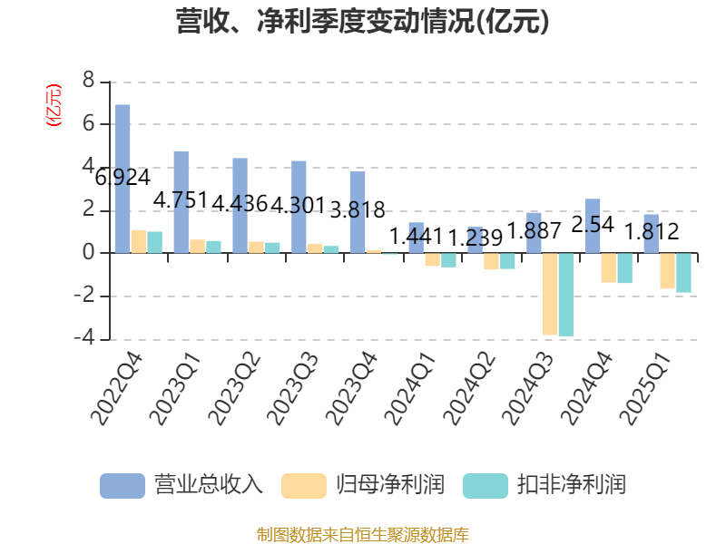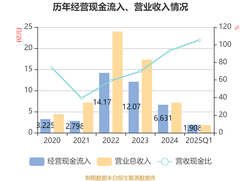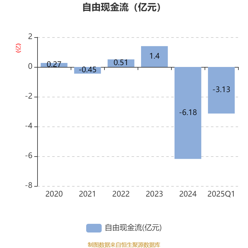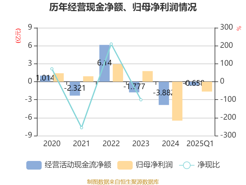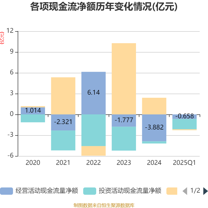 截至2025年一季度末,公司经营活动现金流净额为-6575.89万元,同比增加1.78亿元;筹资活动现金流净额-1311.43万元,同比减少5474.37万元;投资活动现金流净额-1.49亿元,上年同期为1.44亿元。