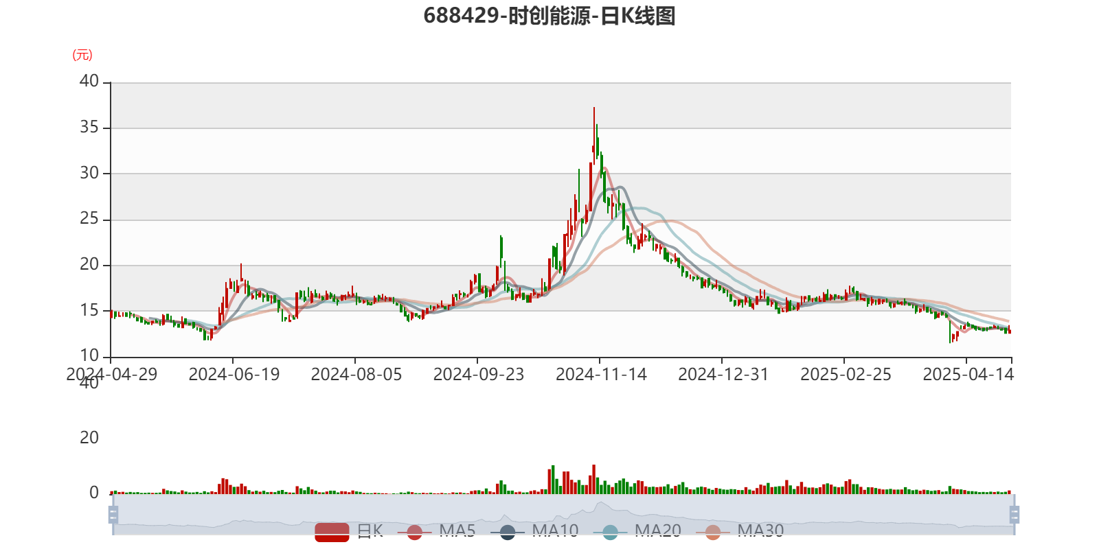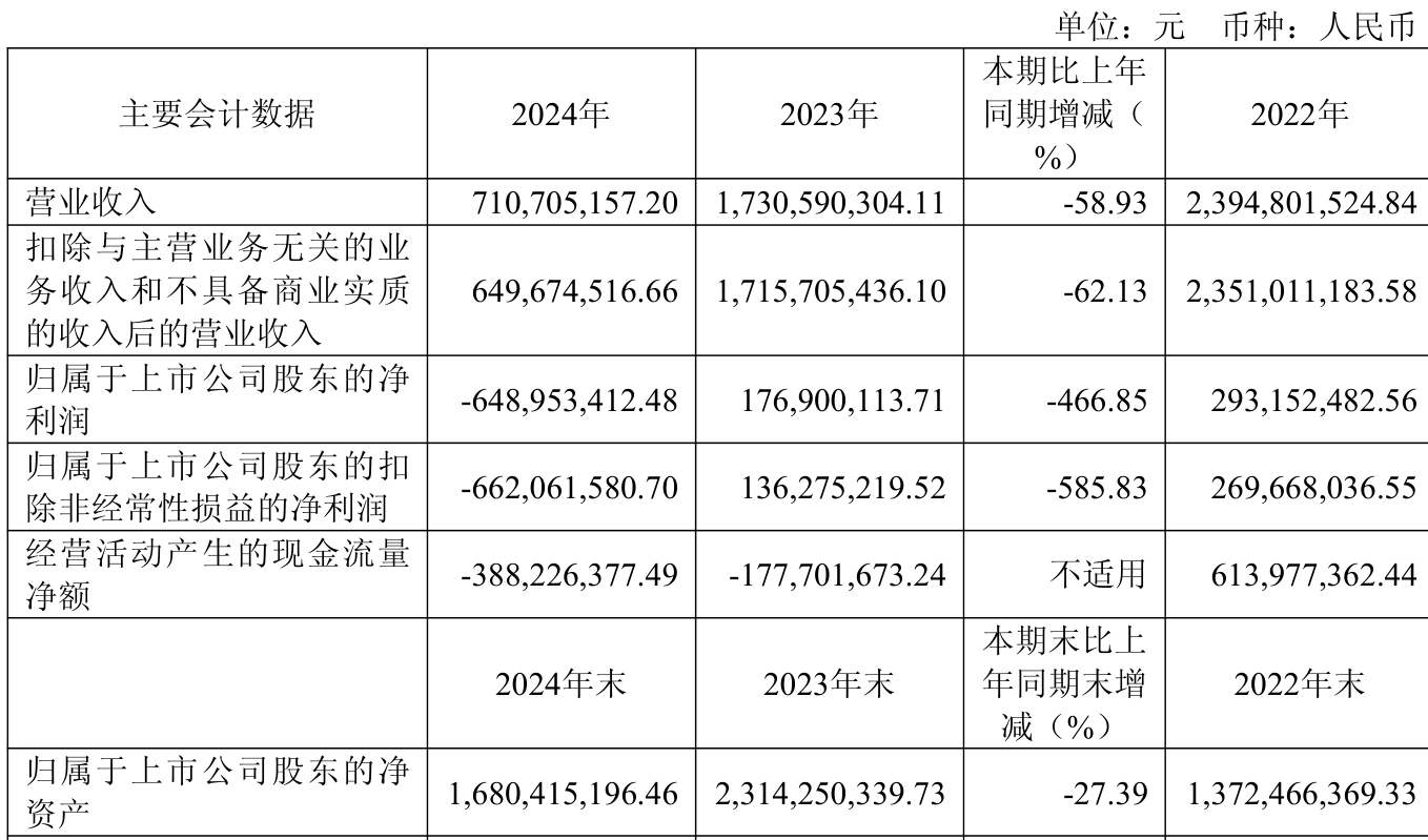 中证智能财讯时创能源(688429)4月29日披露2024年年度报告。2024年,公司实现营业总收入7.11亿元,同比下降58.93%;归母净利润亏损6.49亿元,上年同期盈利1.77亿元;扣非净利润亏损6.62亿元,上年同期盈利1.36亿元;经营活动产生的现金流量净额为-3.88亿元,上年同期为-1.78亿元;报告期内,时创能源基本每股收益为-1.63元,加权平均净资产收益率为-32.63%。