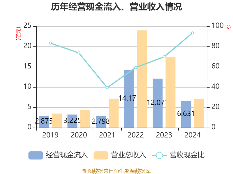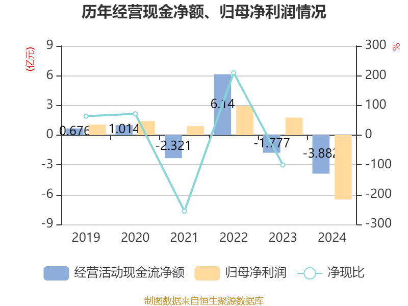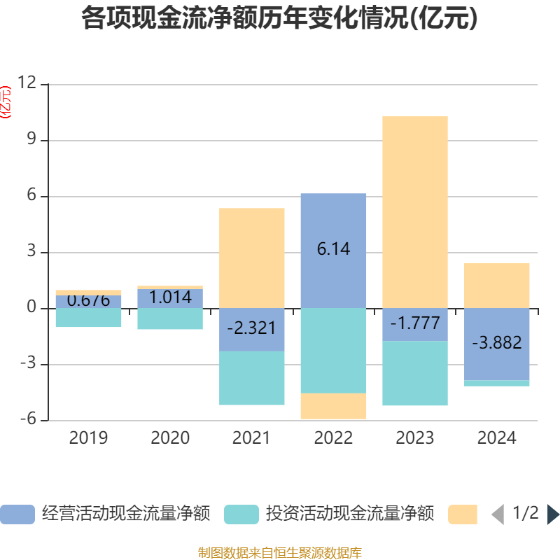 截至2024年,公司经营活动现金流净额为-3.88亿元,同比减少2.11亿元;筹资活动现金流净额2.4亿元,同比减少7.87亿元;投资活动现金流净额-3141.27万元,上年同期为-3.45亿元。