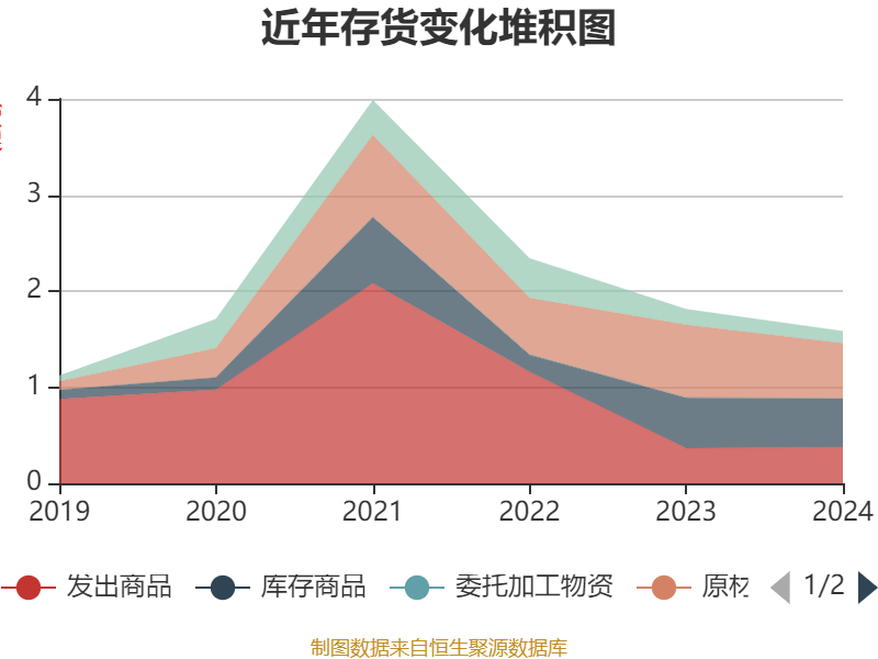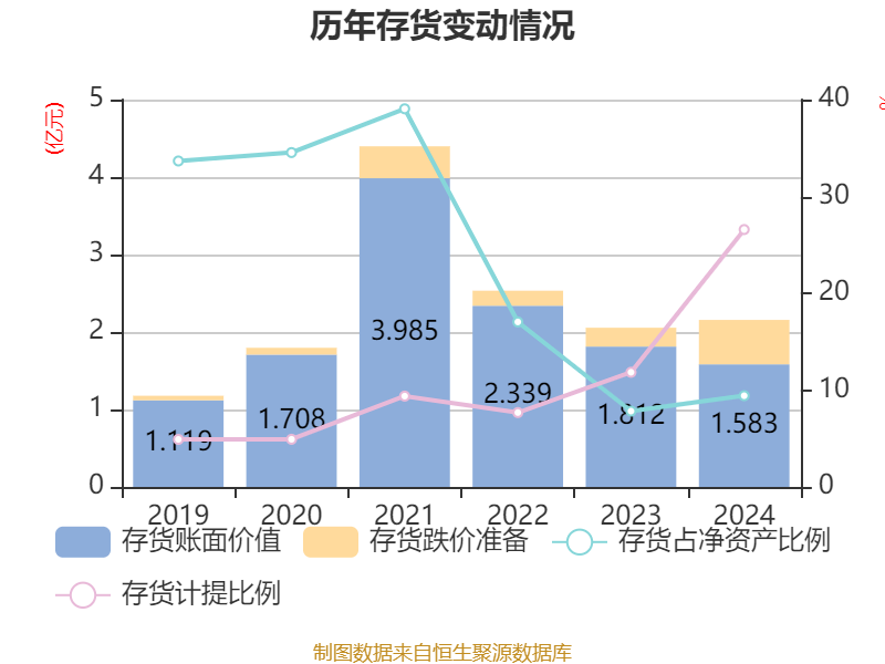从存货变动来看,截至2024年末,公司存货账面价值为1.58亿元,占净资产的9.42%,较上年末减少2291.64万元。其中,存货跌价准备为5728.5万元,计提比例为26.58%。