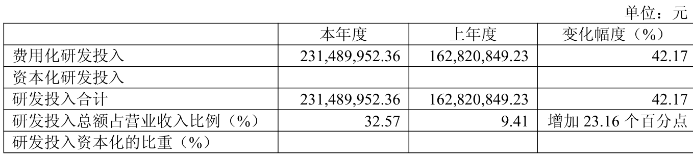 2024年全年,公司研发投入金额为2.31亿元,同比增长42.17%;研发投入占营业收入比例为32.57%,相比上年同期上升23.16个百分点。
