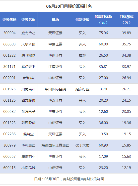 南财投研通数据显示,6月30日,券商给予上市公司目标价共13次,按当日收盘价计算,目标价涨幅排名居前的公司有威力传动、天承科技、源飞宠物,目标价涨幅分别为39.89%、35.75%、34.38%,分别属于风电设备、电子化学品、文娱用品行业。