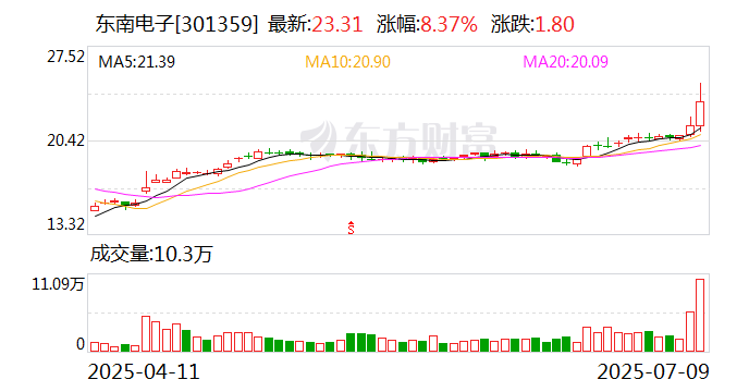 东南电子股价创出历史新高,截至14:40,该股上涨11.58%,股价报24.00元,成交量757.15万股,成交金额1.66亿元,换手率20.71%,该股最新A股总市值达28.84亿元,该股A股流通市值8.77亿元。