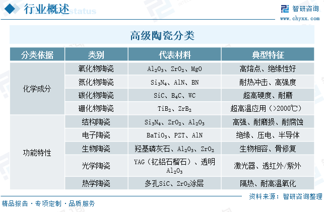 在分类体系上,高级陶瓷主要依据两个维度进行划分:从化学成分角度,可分为氧化物陶瓷、非氧化物陶瓷及复合材料;从功能特性角度,则可分为以力学性能为主的结构陶瓷(高强、耐磨)和具有特殊物理化学性质的功能陶瓷(电子、生物、光学等特殊性能)。