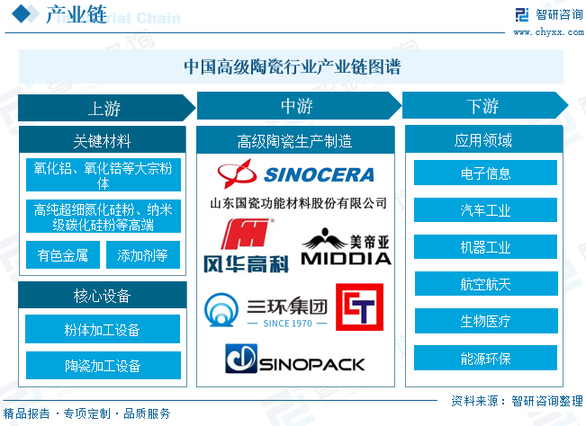 中国高级陶瓷行业已形成从原料制备、产品设计到应用开发的完整产业链。产业链上游主要包括陶瓷粉体(如氧化铝、氧化锆等)、化工原料、有色金属材料以及生产设备(如粉碎研磨设备、烧结炉等),这些原材料和设备为中游制造提供基础支撑;中游涵盖各类高级陶瓷产品的制造,包括电子陶瓷、生物陶瓷(如人工骨、陶瓷义齿)、热/光学陶瓷等,通过将原材料烧结加工成零部件或成品;下游应用领域广泛,涉及电子信息、汽车工业、航空航天、生物医疗、能源环保等领域。