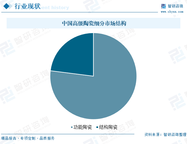 从细分市场结构看,功能陶瓷凭借其在电子元器件、生物医疗等领域的不可替代性,占据市场主导地位,占比约77%;而结构陶瓷受制于高端装备制造、航空航天等领域需求波动及技术壁垒,当前市场份额约为23%,但随着工业母机、新能源装备等领域的国产替代推进,其市场空间有望进一步释放。