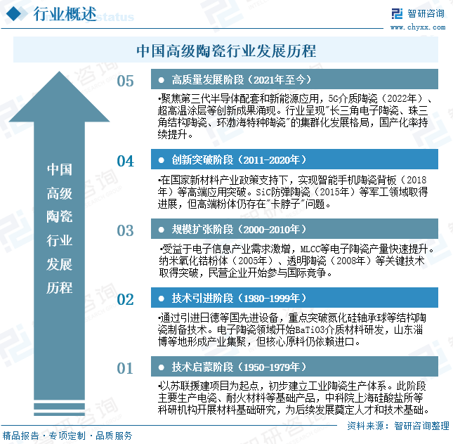 中国高级陶瓷行业经历了从技术引进到自主创新的完整发展轨迹:早期(1950s-1970s)在苏联援助下建立工业陶瓷基础体系,为后续发展奠定人才和技术基础;改革开放后(1980s-1990s)通过引进消化国外技术实现结构陶瓷和电子陶瓷突破;新世纪初期(2000-2010)伴随电子信息产业爆发完成规模扩张;"十二五"以来(2011-2020)在国家政策支持下取得军工和消费电子领域高端应用突破;当前(2021年至今)已形成特色产业集群,在5G通信、第三代半导体等战略新兴领域实现从跟跑到并跑的跨越。行业现呈现应用高端化、技术集成化和制造绿色化三大发展趋势,正加速向全球价值链高端攀升。