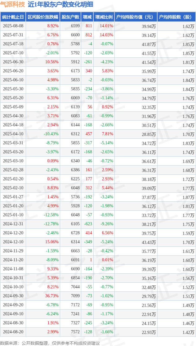 从股价来看,2025年7月18日至2025年8月8日,气派科技区间涨幅为8.92%,在此期间股东户数增加811.0户,增幅为14.01%。