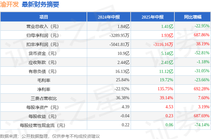 据证券之星公开数据整理,近期渝开发(000514)发布2025年中报。根据财报显示,渝开发净利润同比增长687.86%。截至本报告期末,公司营业总收入1.41亿元,同比下降22.95%,归母净利润1.93亿元,同比上升687.86%。按单季度数据看,第二季度营业总收入6443.78万元,同比下降38.8%,第二季度归母净利润1370.52万元,同比上升303.97%。