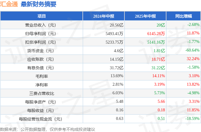 据证券之星公开数据整理,近期汇金通(维权)(603577)发布2025年中报。截至本报告期末,公司营业总收入20.0亿元,同比下降2.68%,归母净利润6145.28万元,同比上升11.87%。按单季度数据看,第二季度营业总收入11.63亿元,同比下降5.92%,第二季度归母净利润4649.92万元,同比上升15.32%。本报告期汇金通应收账款上升,应收账款同比增幅达32.24%。