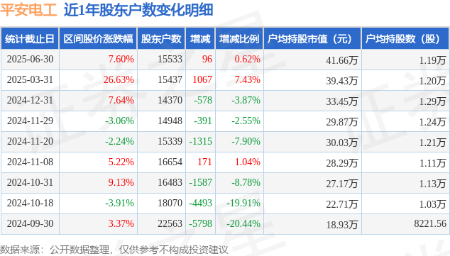 从股价来看,2025年3月31日至2025年6月30日,平安电工区间涨幅为7.6%,在此期间股东户数增加96.0户,增幅为0.62%。
