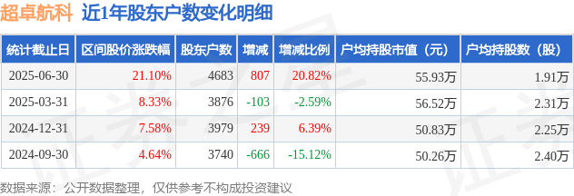从股价来看,2025年3月31日至2025年6月30日,超卓航科区间涨幅为21.1%,在此期间股东户数增加807.0户,增幅为20.82%。