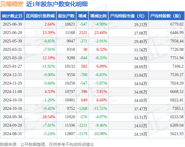 从股价来看,2025年6月20日至2025年6月30日,贝隆精密区间涨幅为2.64%,在此期间股东户数减少547.0户,减幅为4.9%。