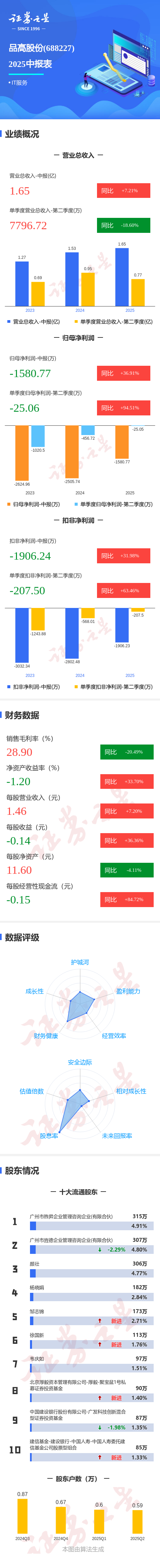 证券之星消息,品高股份2025年中报显示,公司主营收入1.65亿元,同比上升7.21%;归母净利润-1580.77万元,同比上升36.91%;扣非净利润-1906.24万元,同比上升31.98%;其中2025年第二季度,公司单季度主营收入7796.72万元,同比下降18.6%;单季度归母净利润-25.06万元,同比上升94.51%;单季度扣非净利润-207.5万元,同比上升63.47%;负债率34.92%,投资收益257.36万元,财务费用226.69万元,毛利率28.9%。