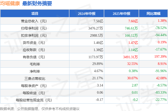 据证券之星公开数据整理,近期均瑶健康(605388)发布2025年中报。截至本报告期末,公司营业总收入7.66亿元,同比上升1.38%,归母净利润746.61万元,同比下降78.52%。按单季度数据看,第二季度营业总收入3.65亿元,同比上升1.36%,第二季度归母净利润-344.1万元,同比下降139.95%。本报告期均瑶健康三费占比上升明显,财务费用、销售费用和管理费用总和占总营收同比增幅达42.08%。