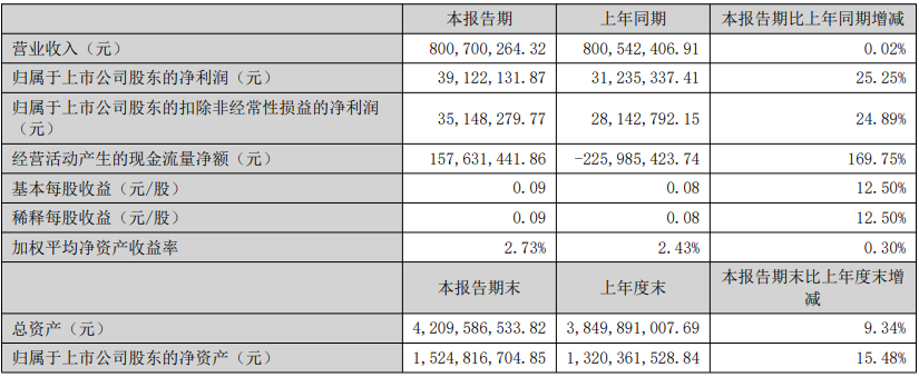 2025年上半年,美瑞新材实现营业收入8.01亿元,同比微增0.02%,在市场波动中维持稳定态势;归母净利润达3912万元,同比增幅25.2%,扣非归母净利润3515万元,同比增长24.9%,盈利指标表现亮眼。经营现金流净额更是实现1.58亿元,同比激增169.8%,现金流健康度大幅提升。