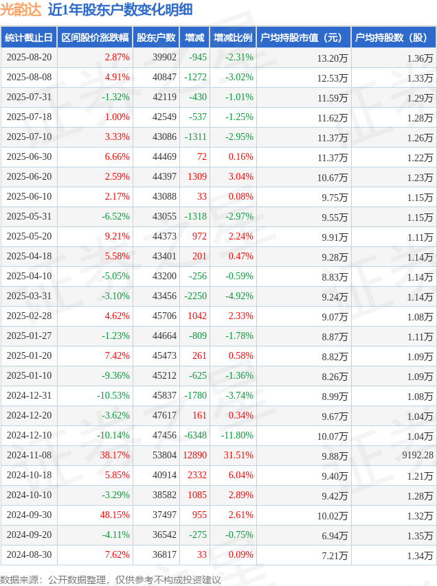 从股价来看,2025年8月8日至2025年8月20日,光韵达区间涨幅为2.87%,在此期间股东户数减少945.0户,减幅为2.31%。