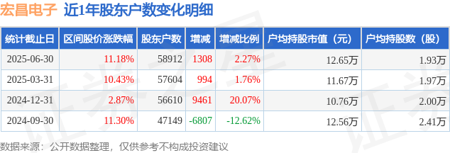从股价来看,2025年3月31日至2025年6月30日,宏昌电子区间涨幅为11.18%,在此期间股东户数增加1308.0户,增幅为2.27%。