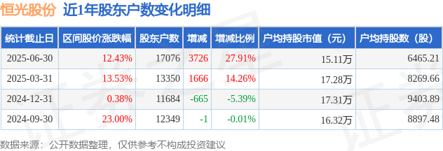 从股价来看,2025年3月31日至2025年6月30日,恒光股份区间涨幅为12.43%,在此期间股东户数增加3726.0户,增幅为27.91%。