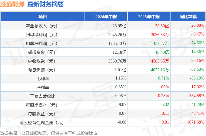 据证券之星公开数据整理,近期胜通能源(001331)发布2025年中报。根据财报显示,胜通能源营收净利润同比双双增长。截至本报告期末,公司营业总收入30.39亿元,同比上升26.88%,归母净利润3036.53万元,同比上升48.47%。按单季度数据看,第二季度营业总收入13.64亿元,同比上升13.75%,第二季度归母净利润79.73万元,同比下降28.86%。