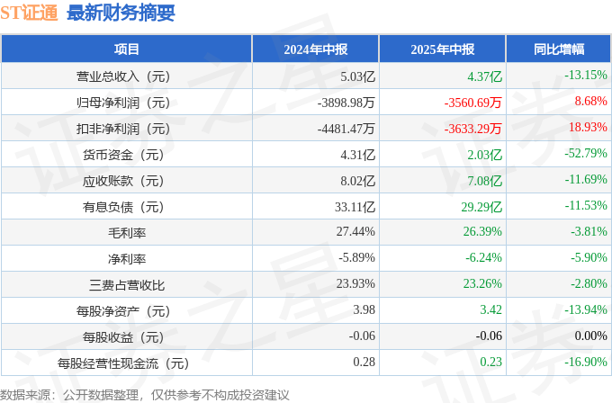 据证券之星公开数据整理,近期ST证通(维权)(002197)发布2025年中报。截至本报告期末,公司营业总收入4.37亿元,同比下降13.15%,归母净利润-3560.69万元,同比上升8.68%。按单季度数据看,第二季度营业总收入2.37亿元,同比下降11.47%,第二季度归母净利润-2888.83万元,同比上升30.77%。本报告期ST证通公司应收账款体量较大,当期应收账款占最新年报营业总收入比达76.57%。