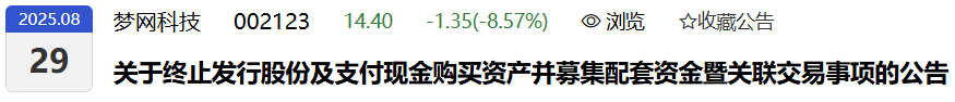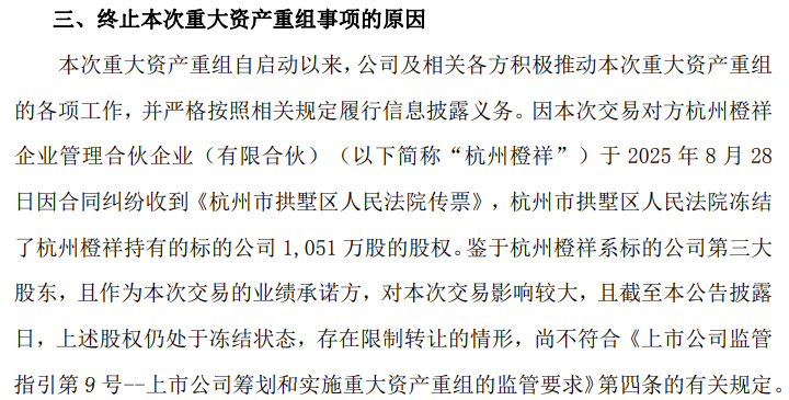 8月29日,梦网云科技集团股份有限公司公告终止发行股份及支付现金购买资产暨关联交易事项。梦网科技于2025年1月2日起推进发行股份及支付现金购买杭州碧橙数字技术股份有限公司全部股份并募集配套资金事项。因本次交易对方杭州橙祥企业管理合伙企业(有限合伙)于2025年8月28日因合同纠纷收到《杭州市拱墅区人民法院传票》,杭州市拱墅区法院冻结了杭州橙祥持有的标的公司1051万股的股权。鉴于杭州橙祥系标的公司碧橙数字第三大股东,且作为本次交易的业绩承诺方,对本次交易影响较大,且截至本公告披露日,上述股权仍处于冻结状态,存在限制转让的情形,尚不符合《上市公司监管指引第9号--上市公司筹划和实施重大资产重组的监管要求》第四条的有关规定。经公司充分审慎研究及与交易对方友好协商,决定终止本次交易事项。这一纸公告宣告碧橙数字卖身上市公司失败,而3年前碧橙数字闯关创业板IPO失败。其主要股东之一杜鹏因犯开设赌场罪被一审判刑特别引人关注。