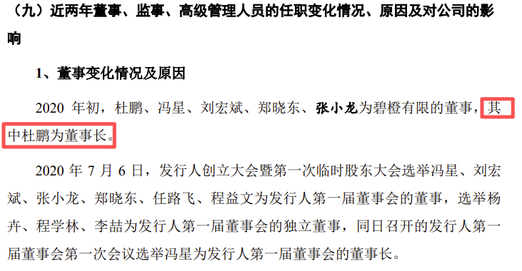招股书显示,杜鹏2020年初还是公司董事长。2020年7月6日公司创立大会后召开的第一届董事会选举冯星为公司董事长。而杜鹏2020年6月被一审判刑。