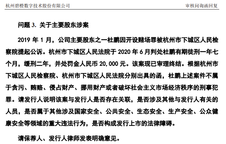 首轮审核问询函“问题 3. 关于主要股东涉案”显示:2019 年 1 月,公司主要股东之一杜鹏因开设赌场罪被杭州市下城区人民检察院提起公诉。杭州市下城区人民法院于 2020 年 6 月判处杜鹏有期徒刑一年七个月,缓刑二年,并处罚金人民币 20,000 元。审核中心要求公司说明:该案与发行人是否存在关联,是否涉及其他与发行人有关的人员,是否属于其他涉及国家安全、公共安全、生态安全、生产安全、公众健康安全等领域的重大违法行为,是否构成发行上市的法律障碍。
