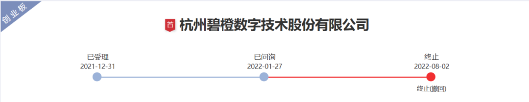 碧橙数字申报创业板IPO于2021年12月31日获得受理,完成一轮审核问询回复,于2022年8月2日被终止审核。