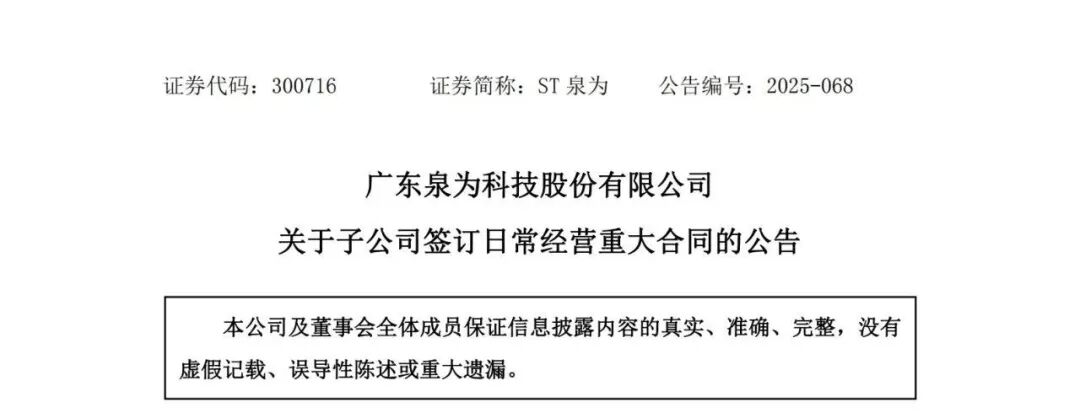 在资本市场的风云变幻中,ST泉为(维权)(300716.SZ)的一举一动都备受瞩目。深陷困境的它,正凭借一系列关键事件,试图扭转局势,在面临业绩承压的情况下,却以一份重磅订单合同迎来一线曙光,而这份“大单”能否成为影响其命运走向的大事件呢?