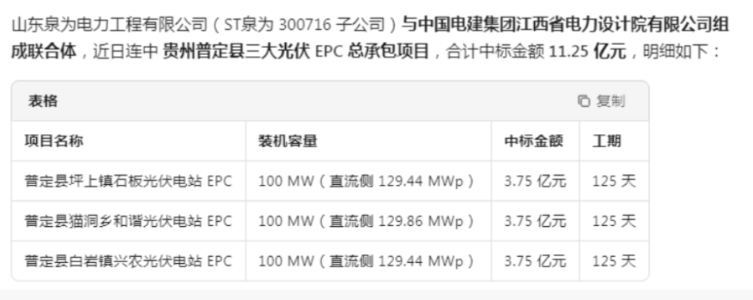 8月25日,一则重磅消息如平地惊雷般在资本市场炸开。ST泉为发布公告显示,其子公司山东泉为电力工程有限公司动作频频。先是与中国电建集团江西省电力设计院有限公司成功签订《项目合作协议》,紧接着又与中国电建以及普定县联鑫能源开发有限公司一口气拿下了《普定县猫洞乡和谐光伏电站EPC总承包合同》、《普定县白岩镇兴农光伏电站EPC总承包合同》、及《普定县坪上镇石板光伏电站EPC总承包合同》。
