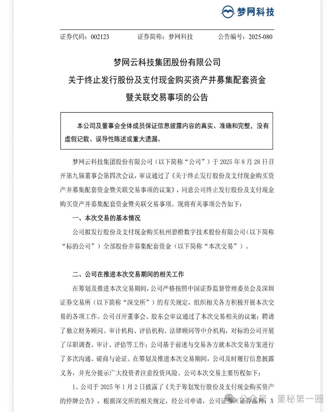 8月29日,梦网云科技集团股份有限公司公告终止发行股份及支付现金购买资产暨关联交易事项。