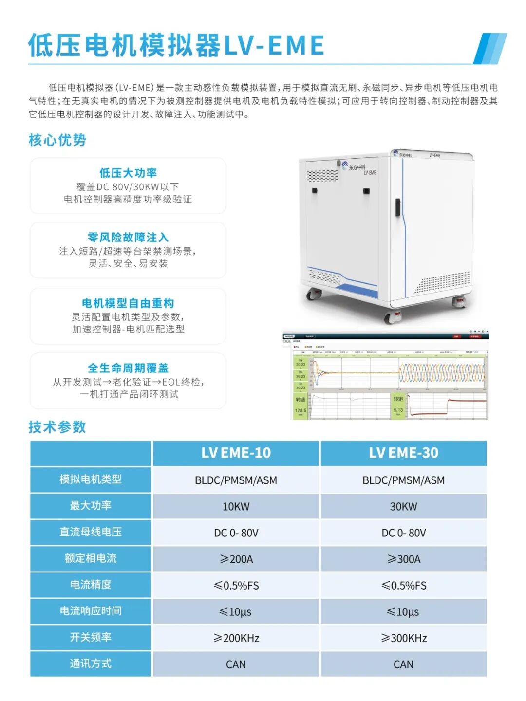 高压测试系统、在环仿真测试、智能驾驶测试、智舱及网联测试、EMC测试、非标定制测试、氢储充测试作为东方中科的传统优势解决方案再次在测试展亮相。主动悬架测试系统、低压电机模拟器LV-EME作为全新产品在本次展会闪亮登场。东方中科作为国内专业的测试技术和科技服务公司,多年来深耕新能源汽车综合测试服务,我们的产品和解决方案已经积累了多年行业经验,满足了众多客户在车辆开发、测试验证等众多需求。