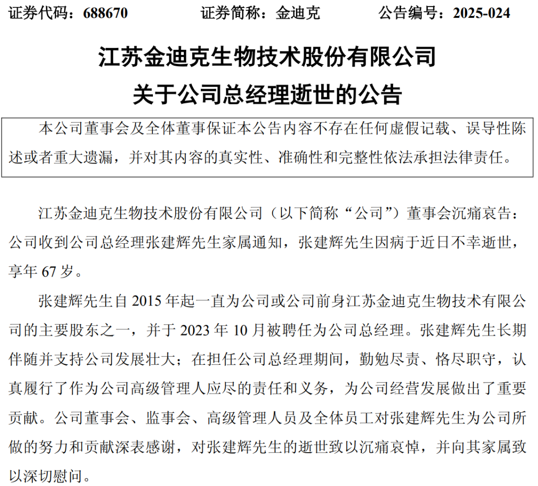 2025年9月11日,上交所科创板上市公司金迪克(SH.688670)发布公告沉痛告知投资者,公司总经理张建辉因病于近日不幸逝世,享年67岁。