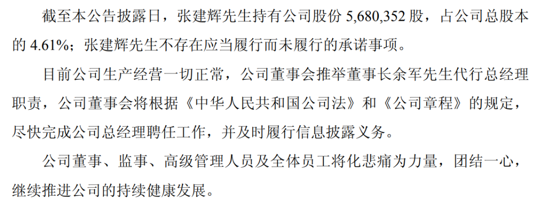 目前,公司生产经营一切正常,董事会已推举董事长余军代行总经理职责,并将尽快完成新任总经理聘任工作,相关进展将及时披露。