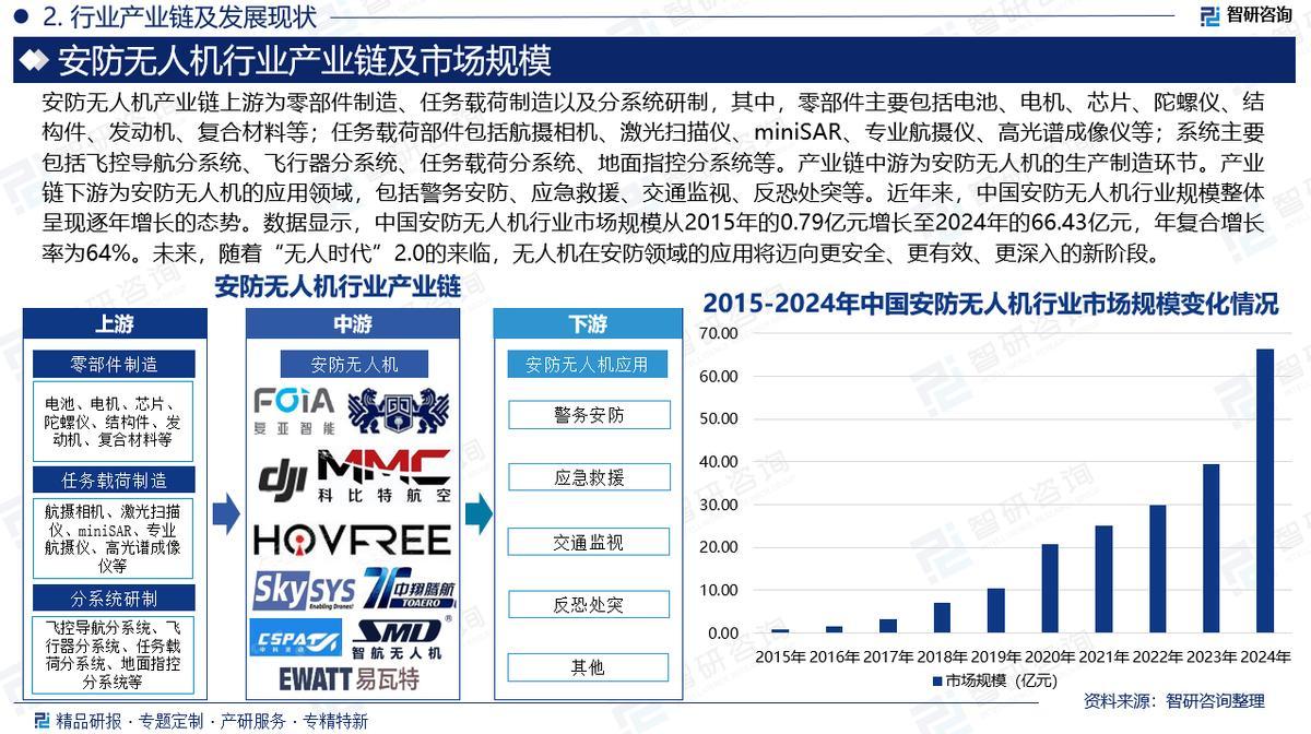 安防无人机属于工业级无人机,是指用于城市安防监控领域的无人机。安防无人机分类方式较多,按重量,安防无人机可分为轻微小型无人机和中大型无人机;按平台类型,安防无人机可分为多旋翼无人机和固定翼无人机;按应用领域,安防无人机可分为消防无人机、警用安防无人机、民用安保无人机、军用无人机等。近年来,中国安防无人机行业规模整体呈现逐年增长的态势。数据显示,中国安防无人机行业市场规模从2015年的0.79亿元增长至2024年的66.43亿元,年复合增长率为64%。未来,随着“无人时代”2.0的来临,无人机在安防领域的应用将迈向更安全、更有效、更深入的新阶段。同时,5G的高带宽和低延迟、人工智能的飞行安全保障以及大数据的信息处理和应用,都将赋予安防无人机更强的功能性,为安防无人机打造创新的智能功能奠定基础。随着无人机技术的持续演进及其在安防领域的应用不断深化,安防无人机行业的竞争也日趋激烈。在全球市场中,中国安防无人机技术处于领先地位,在技术研发能力、生产制造水平和行业影响力等方面具备显著优势。技术研发能力作为安防无人机企业的核心竞争力,中国企业持续通过自主创新,全面提升飞行性能、自动化与智能化水平、安全可靠性及任务载荷能力等关键技术指标,从而不断增强自身在行业中的竞争优势和品牌影响力。目前,中国安防无人机行业的代表企业包括纵横股份、观典防务、大疆、科比特、华飞智能、星逻智能、中科灵动、复亚智能、易瓦特等,这些企业凭借先进的技术和产品,为社会安防体系的构建与监控效率的提升提供了重要支撑。