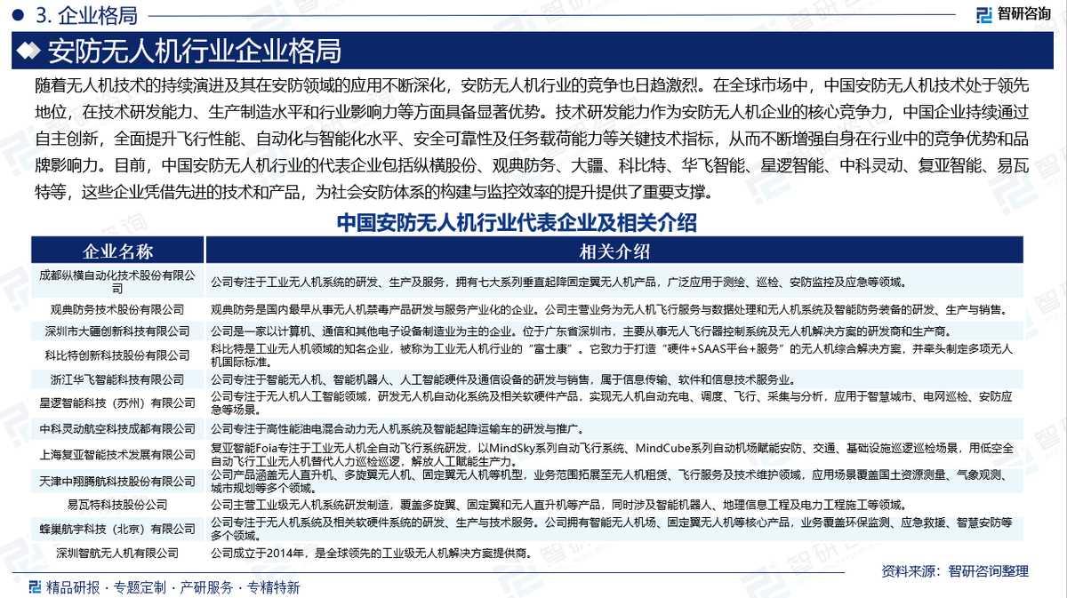 企业格局:随着无人机技术的持续演进及其在安防领域的应用不断深化,安防无人机行业的竞争也日趋激烈。在全球市场中,中国安防无人机技术处于领先地位,在技术研发能力、生产制造水平和行业影响力等方面具备显著优势。技术研发能力作为安防无人机企业的核心竞争力,中国企业持续通过自主创新,全面提升飞行性能、自动化与智能化水平、安全可靠性及任务载荷能力等关键技术指标,从而不断增强自身在行业中的竞争优势和品牌影响力。目前,中国安防无人机行业的代表企业包括纵横股份、观典防务、大疆、科比特、华飞智能、星逻智能、中科灵动、复亚智能、易瓦特等,这些企业凭借先进的技术和产品,为社会安防体系的构建与监控效率的提升提供了重要支撑。