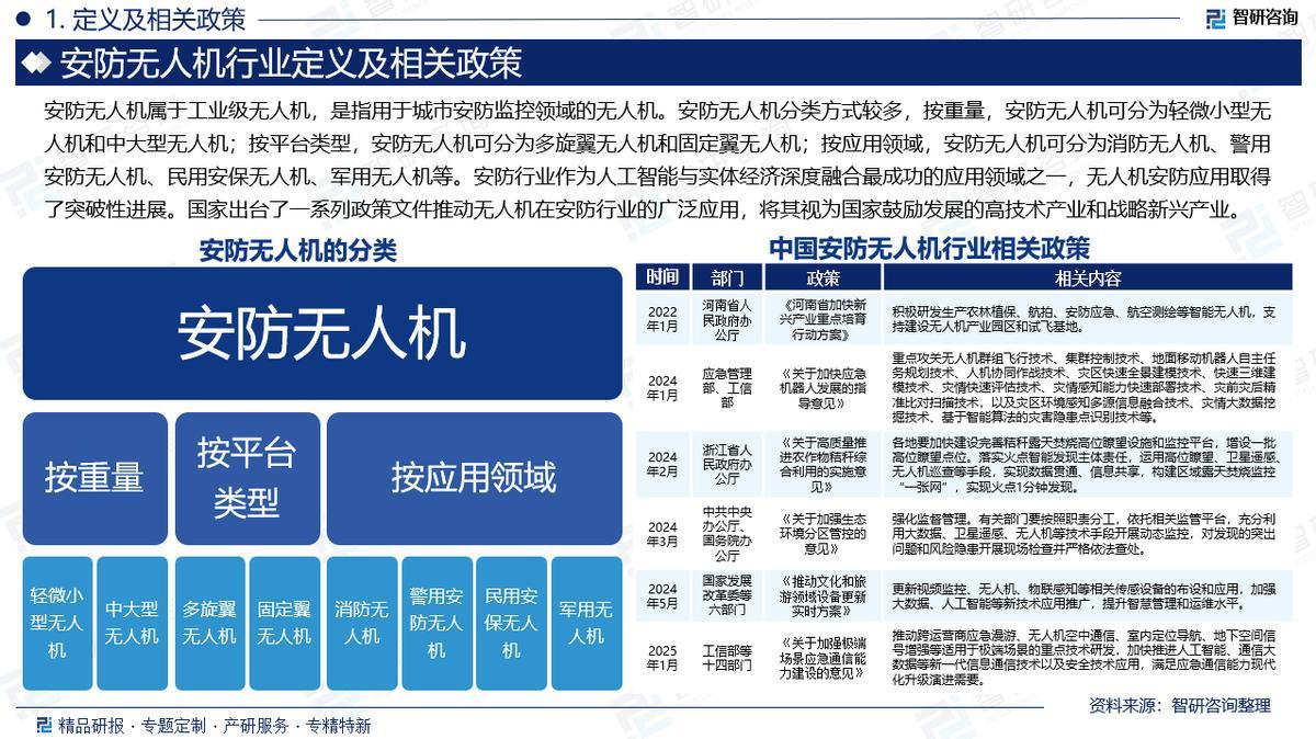 行业发展相关政策:随着人工智能、大数据、5G通信、物联网等技术的发展,无人机产业迎来前所未有的发展契机,成为了新一轮产业革命和科技革命的热点,也成为了加强人工智能产业落地和国防建设的重要方向。安防行业作为人工智能与实体经济深度融合最成功的应用领域之一,无人机安防应用取得了突破性进展。国家出台了一系列政策文件推动无人机在安防行业的广泛应用,将其视为国家鼓励发展的高技术产业和战略新兴产业。