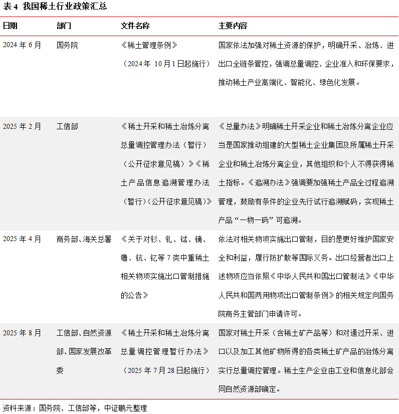 强化稀土产业链管理,供给端约束成效初显。稀土战略地位越来越受到重视,近年来我国不断出台政策,强化稀土管理。中国稀土储量保持4400万吨,占全球约48%,还掌控全球68.5%的稀土矿产量和90%的钕铁硼磁材产能,形成从矿山开采到终端应用的完整产业链。随着国家对稀土产业管控加强,通过并购整合与出清非法产能,在资源端将形成北方稀土(掌控全国75%的轻稀土开采配额和67%的冶炼分离指标)和中国稀土集团(垄断中重稀土供应、掌控25%轻稀土开采配额和33%的冶炼分离指标)“南北双寡头”格局,这种高度集中的市场结构赋予龙头企业显著的成本优势和强大的议价能力,同时有效避免过去“窝里斗”式的低价竞争,我国在全球稀土市场的话语权与影响力将稳步提升。