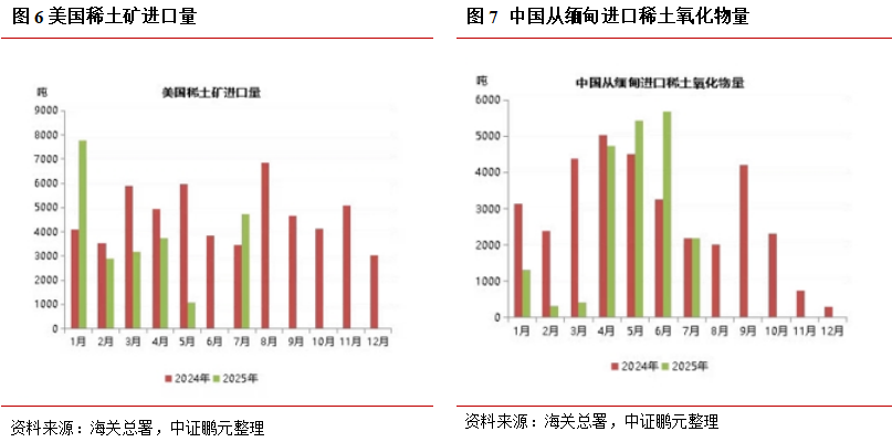 进口原料供给收缩,稀土磁材价格趋涨。我国在稀土冶炼分离环节具有巨大优势,而国外稀土产业链大多缺失该环节,这使得境外开采的稀土矿也需要在我国境内进行冶炼分离。缅甸与美国是中国最主要的稀土进口贸易伙伴,2023年进口量占比分别达41.7%和38.59%,马来西亚、老挝、越南分别占11.14%、6.55%、1.88%。2024年整体进口量出现了下降趋势,缅甸重稀土进口减少2.77 万吨,美国轻稀土进口减少1.12万 吨;2025年1-7月,缅甸进口的稀土原料中(稀土氧化物和稀土化合物),REO总含量同比下降约23.6%,美国进口稀土金属矿23380.5吨,同比减少26.3%。缅甸因政局动荡、边境关闭和地震等因素,导致我国自缅甸的稀土进口量急剧下降,目前尽管边境恢复通关,但由于矿商与地方政府之间的利益博弈,稀土供应仍未完全恢复正常;美国进口减少主因美国推进稀土产业链本土化战略,自建分离冶炼产能,他们的稀土金属矿或逐步供应给当地的稀土冶炼厂商,预计未来进口美国稀土矿持续减少。全球稀土矿供应的不确定性也导致市场紧张,助涨稀土磁材价格。