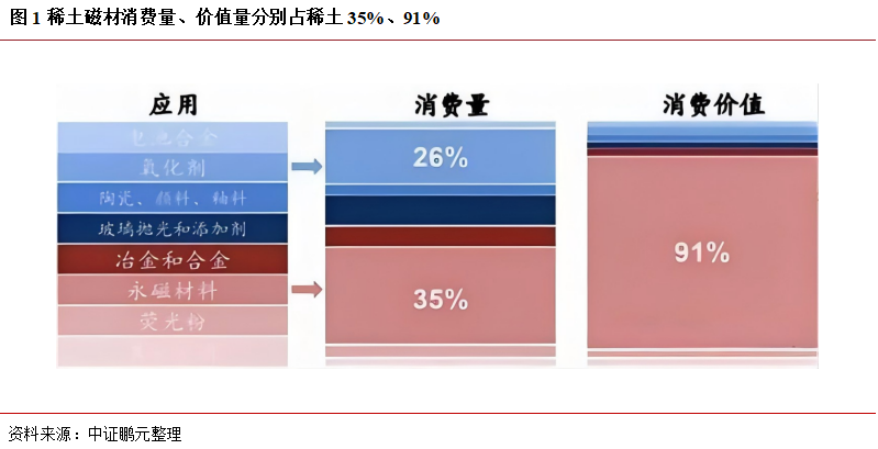 稀土作为重要的不可再生资源,具备难以替代的优异磁、光、电性能,对于改善产品性能、丰富产品种类、提升生产效率发挥着重要作用,被誉为“新材料之母”。将稀土金属加工制成稀土材料,依据功能可划分为稀土永磁、催化、发光、储氢、抛光等几类材料,这些材料能够应用于各个领域。其中,稀土永磁材料是行业内应用最为广泛的一类材料,也是价值量最高的一种。据《世界稀土产业格局变化与中国稀土产业面临的问题》显示,稀土永磁材料在全球稀土消费量中的占比达35%,同时由于其合成工艺复杂且要求较高,其价值量达到了91%,稀土永磁材料已成为稀土领域发展速度最快、规模最大、体系最完整、最为重要的细分及应用赛道。